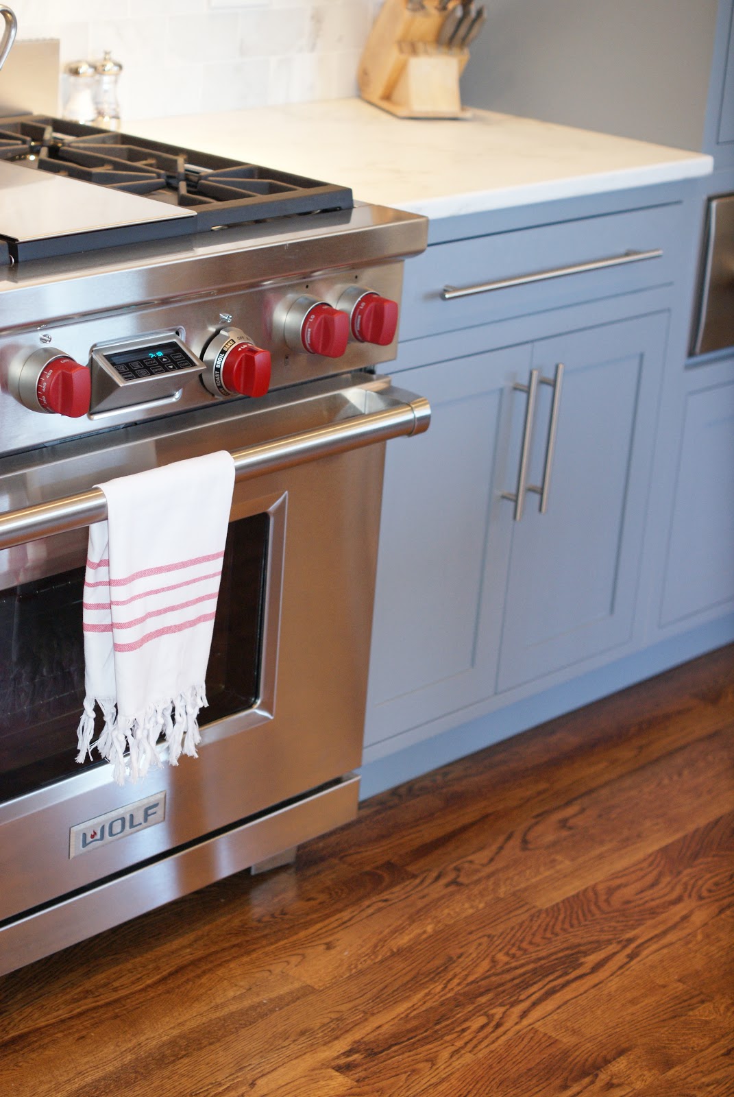 We decided to install double arm sconces on either side of her downdraft hood for added interest and task lighting, and I love they are unexpected, yet functional.